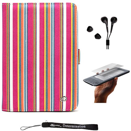 Pink Premium Nylon Flip Portfolio Protection Cover Case with Crayon Stripes Design for Amazon Kindle 3 ( WiFi - 3rd Generation ) * Includes Anti Glare Screen Protector Guard * Includes High Quality HD Noise Filter Earphones Reviews